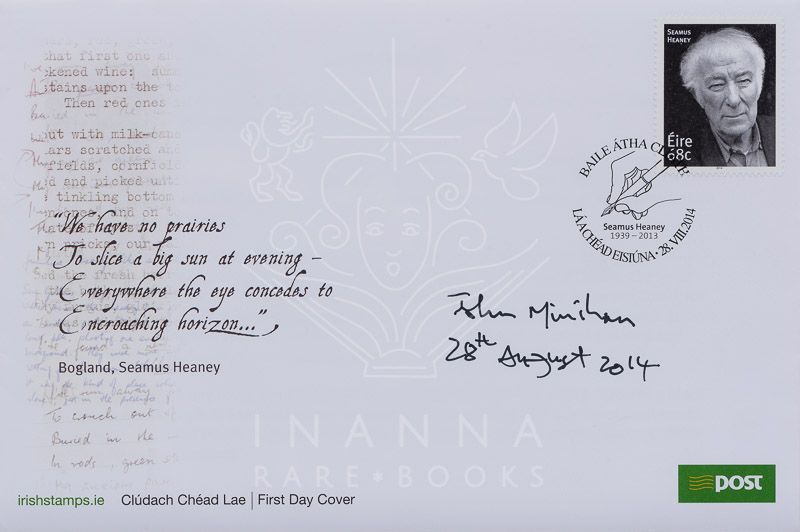 Vintage Photograph on archival paper / Vintage First Day Cover with extra signature by John Minihan. Dublin, 2014. Image of the Photograph: 16 cm x 24 cm / First Day Cover: 18 cm x 12 cm. Overall Framed Size: 79 cm wide x 53,5 cm high. From the personal library of irish photographer John Minihan. Titled and signed by John Minihan. Beautifully framed (see multiple images on our website). Our company knows of an edition of four photographs and signed First Day Covers, which we bought from John Minihan in 2014 and which he signed in 2014. Later, signed First Day Covers are circulating and we have some of those in our archive for sale. But since John Minihan has sold the rights to most of his iconic images to UCC in Cork, none of the photographs are reprinted by the photographer and that makes this combination of the signed Seamus Heaney photograph, combined with the First Day Cover, signed actually on August 28th of 2014, very scarce. We have an edition of 3 (three) left. One is part of the “John Minihan Photography Collection”, which we are selling on our website (see under “Libraries & Collections”) and two are for sale on the free international market. The here offered, beautifully framed version, is one of these two. The price includes free shipping as a framed version within Ireland / The price includes free international shipping per UPS Courier but only unframed (we pay for framing in your home-country) !