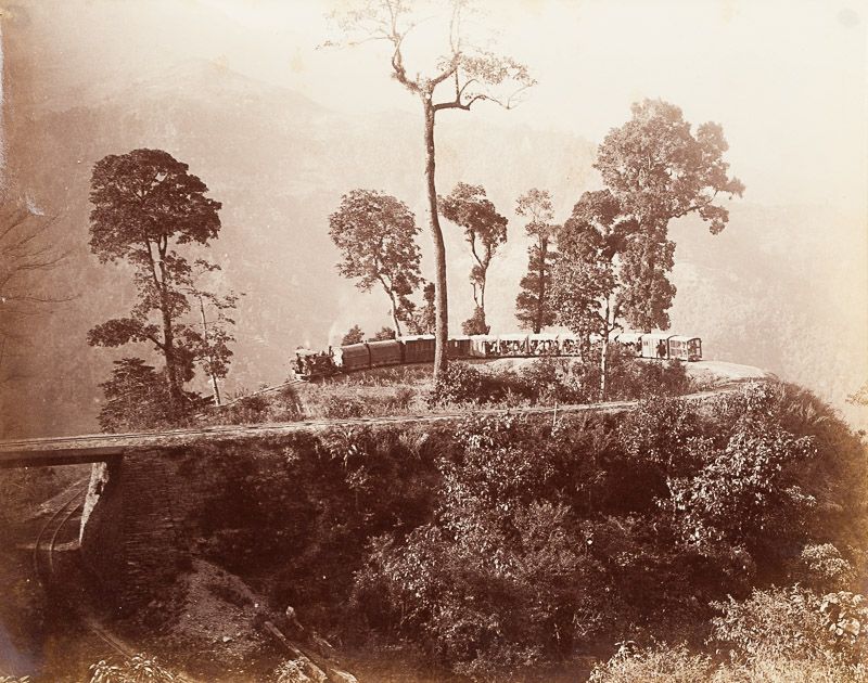 Collection of two (2) 19th century photographs of traditional tourist locations in Darjeeling / India. Included are: 1. View of the Himalaya from Plateau in Darjeeling / 2. The Loop at Agony Point Darjeeling-Himalayan Railway.